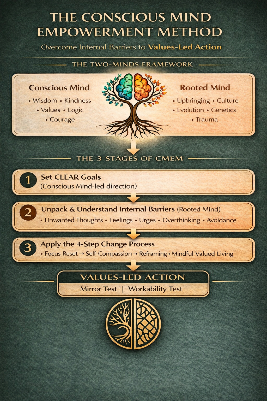 CMEM is informed by the Two-Minds Framework, which distinguishes between the Rooted Mind (learned, instinctive, protective) and the Conscious Mind (deliberate, values-led decision making).